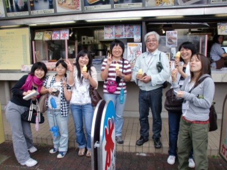(左) 3日連続でソフトクリームを食べたEnami先生。女の子に囲まれて