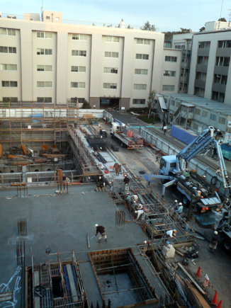 右:そして,更地だったE館の東には,6階建ての建物の地下と1階ができつつあります.(え)