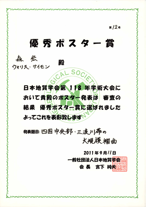 D2のMori君が,日本地質学会第118年学術大会で,優秀ポスター賞.