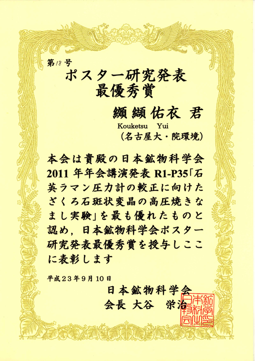 D2のKouketsuさんが,2011年日本鉱物科学会年会で,最優秀ポスター賞.