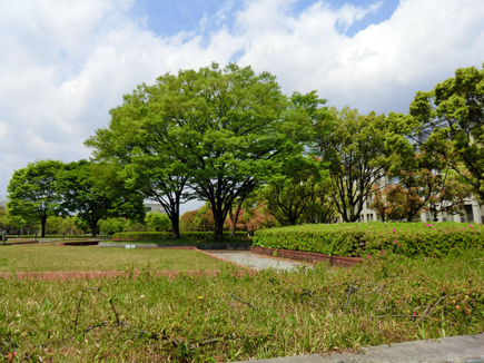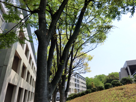 博物館前の御衣黄は赤みを増し,キャンパスは新緑の季節です.(え)